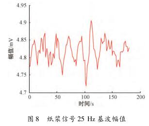 在頻域中對紙漿信號觀察時發(fā)現(xiàn),紙漿信號的漿液噪聲頻帶在零頻率點附近,距離流量信號基波頻率點較遠,對基波幅值和各奇次諧波幅值基本沒有影響,紙漿信號在頻域中的圖形如圖7所示。選擇一組采集的紙漿信號,把其等分成數(shù)段,利用MATLAB計算每段數(shù)據(jù)在基波處的幅值并提取保存在一個數(shù)組中,使用繪圖工具畫出來,如圖8所示。可見,基波幅值在4.7~4.95mV變化,波動較小。因此,提取到的與流量相關(guān)的感應(yīng)電動勢信號幅值會比較穩(wěn)定。