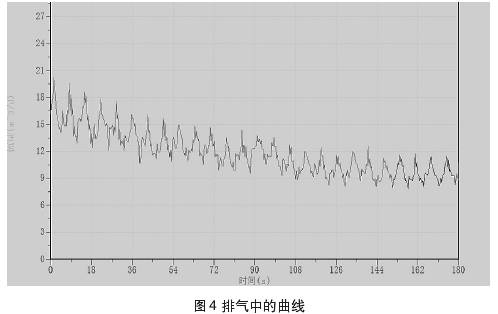 圖4、圖5中所示曲線為測量過程中所截取的集流傘中所聚集的氣相,通過排氣通道排出時與排出后的測量曲線。測試過程中錄取到的儀器排氣的過程,當(dāng)集流傘完全支開后仍需要開啟流量測試進(jìn)行實(shí)時檢測,否則可能會錄取資料失真。