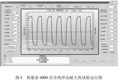 本文研究的 4000 次冷熱沖擊試驗的實現(xiàn)具有以下特點: (1)基于“工控機 +水泵 + 化工污水流量計”的閉環(huán)控制系統(tǒng),實現(xiàn)了流量自動反饋調(diào)節(jié),滿足試驗要求; (2)通過四個開關(guān)閥的時序切換,自動控制試驗溫度,很好的完成了 4000 次溫度沖擊試驗; (3)通過“工控機 + 數(shù)據(jù)數(shù)據(jù)采集卡”的數(shù)據(jù)采集系統(tǒng),實時監(jiān)控試驗過程中的流量、溫度、壓力等相關(guān)參數(shù),實現(xiàn)試驗方式的自動控制,并能對試驗數(shù)據(jù)進行分析與評定。 (4)試驗的全過程為智能自動化,可無人員留守看護。試驗結(jié)果可直接反映出熱量表在長時間運行后的可靠性。為我國熱量表耐久性試驗研究提供檢測手段,為促進產(chǎn)品質(zhì)量提升做好技術(shù)保障。